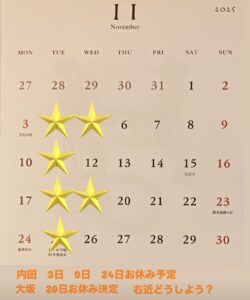 今月は、11/3 11/9 11/24の㊗️と日曜日定休日以外はおりますのでよろしくお願い致します❣️