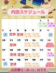 定休日のお知らせとスタッフのスケジュールのご案内です!今月もよろしくお願い致します♀️♀️