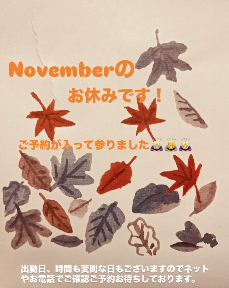 早くもので今日から11月です❣️ 定休日のお知らせとスタッフのスケジュールのご案内です!今月もよろしくお願い致しますɤ…